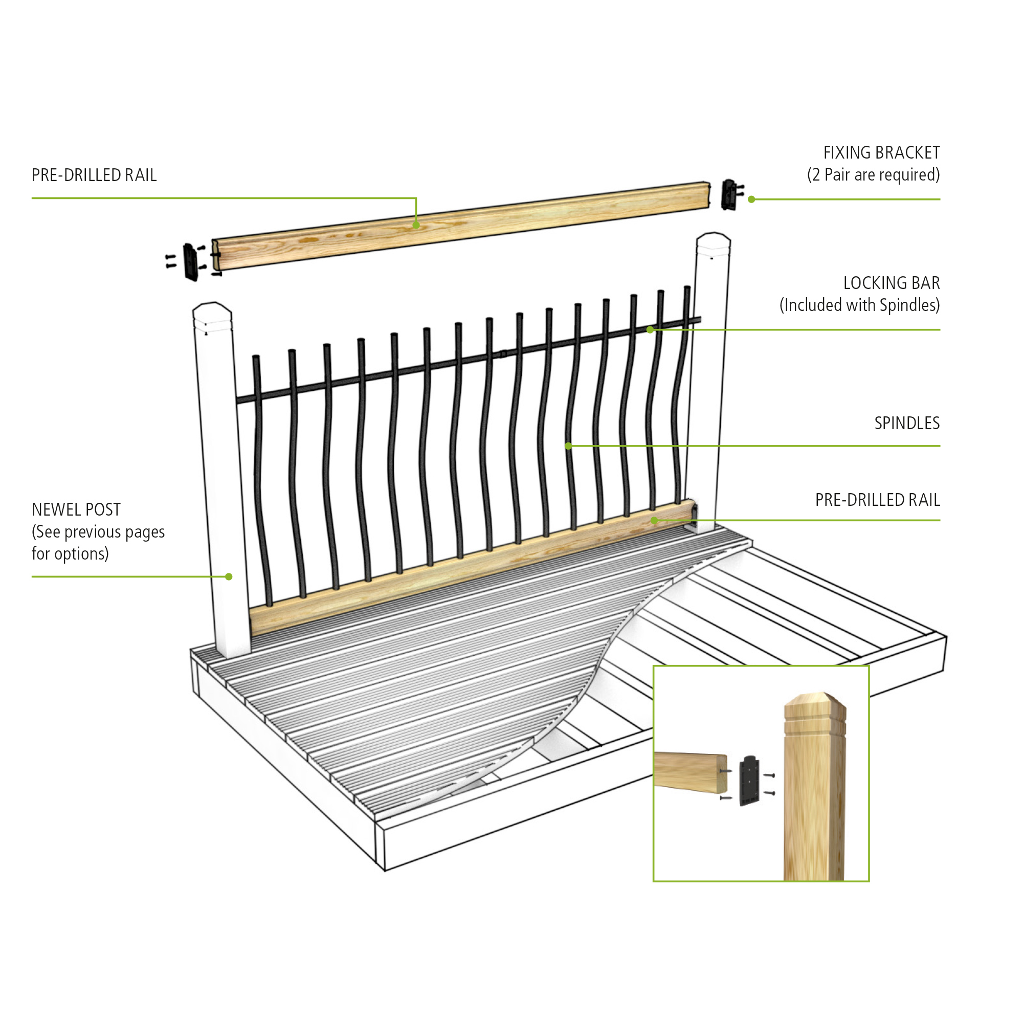 These 15 curvy black powder coated balusters blend perfecty with timber to create a stunning look include locking bar to keep the spindles in place