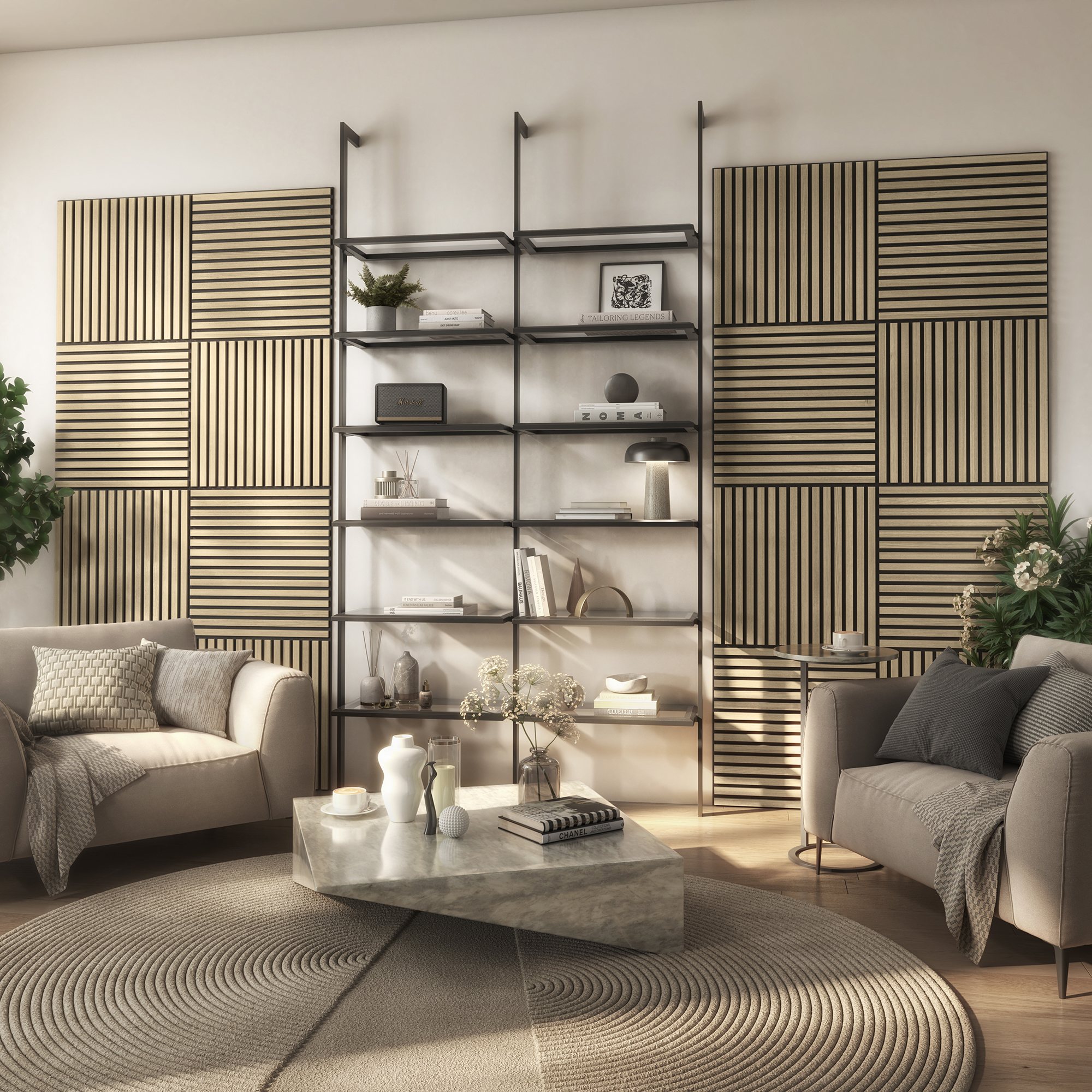 Revitalise your room with our Light Oak square acoustic slat wall panels, designed to effortlessly combine style and functionality while enhancing the acoustics of your room.